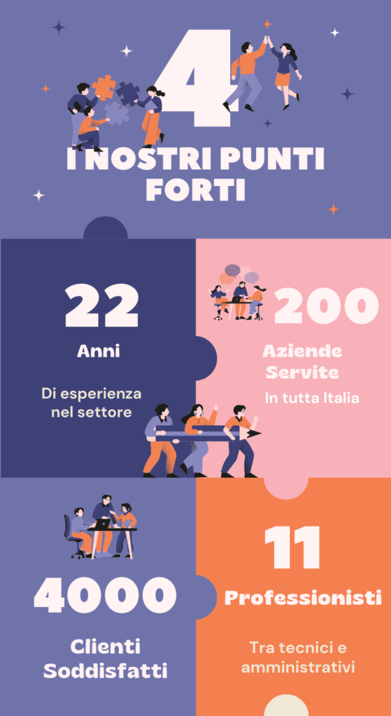 Da oltre 22 anni siamo impegnati a fornire servizi di eccellenza su tutto il territorio italiano, con oltre 200 aziende e più di 4000 clienti. Il nostro team, composto da 11 professionisti tra tecnici e amministrativi, è in costante aggiornamento e formazione, pronto a soddisfare le esigenze della propria clientela. Il nostro punto di forza è quella di prendere in carico il problema del cliente e risolverlo.